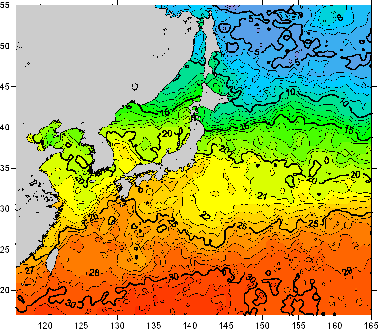 o 2010년 06월 14일 북서태평양 광역해양 수온분포 입니다. o 아래 위성 수온분포도는 국립수산과학원(NFRDI, Korea)과 일본동북대학교 (Tohoku University, Japan)가 공동연구개발 진행중, 1차 연구결과인 것으로 구름의 영향을 배제한 신기술의 수온정보입니다.