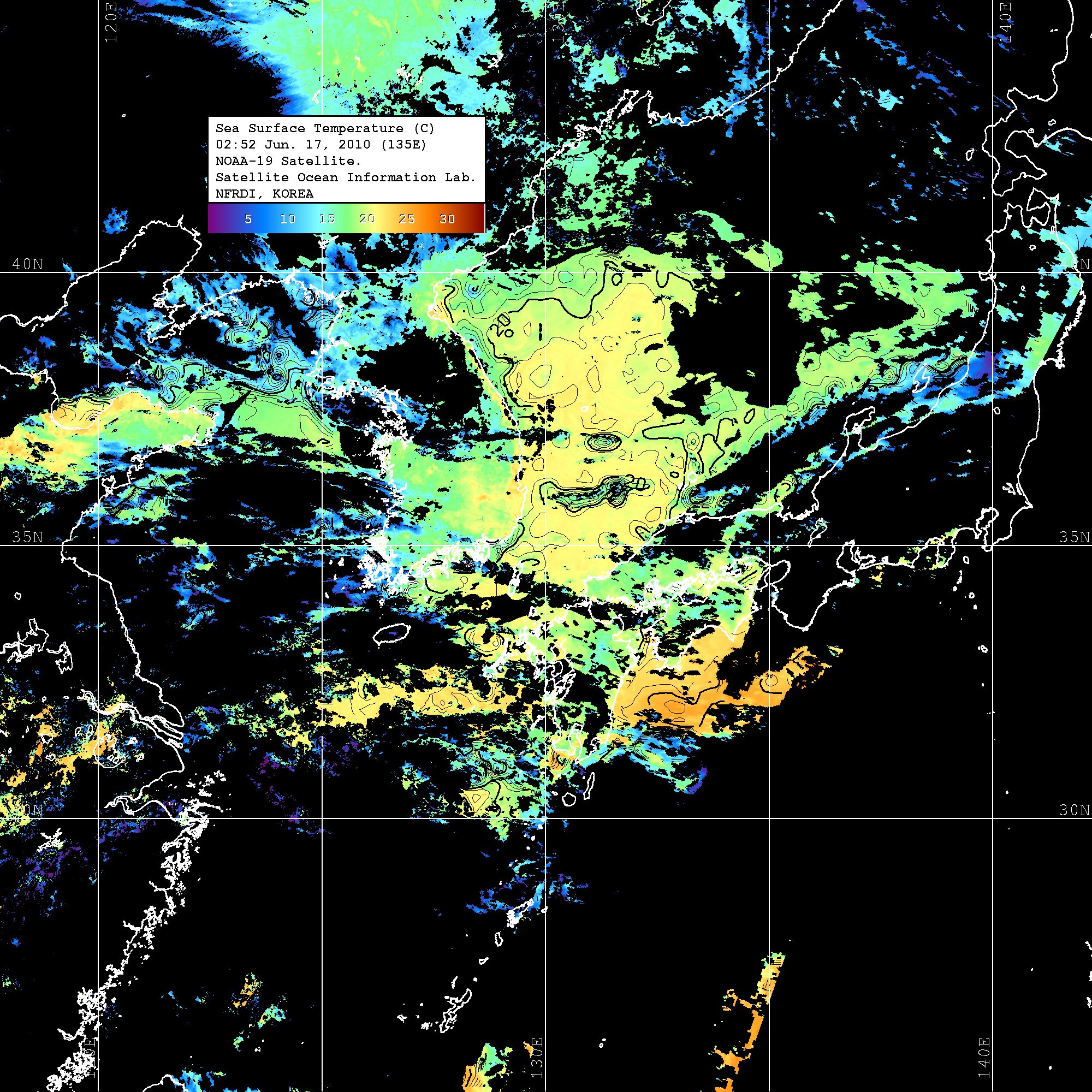 o 2010년 06월 17일 02시 52분 NOAA-19호 위성영상입니다. o 수온분포는 범례를 참고하시기 바랍니다. o 검은색은 구름을 나타냅니다. o 그림을 클릭하시면 크게 보실 수 있습니다.