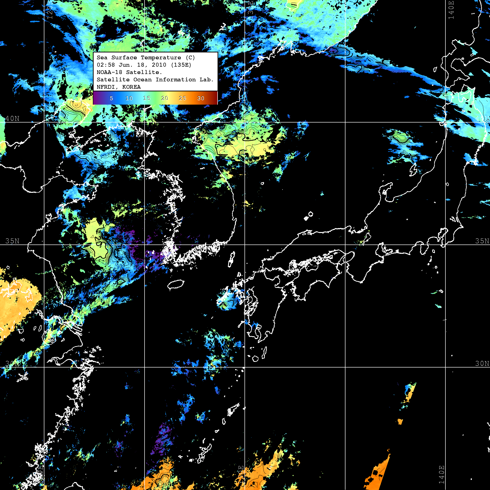 o 2010년 06월 18일 02시 58분 NOAA-18호 위성영상입니다. o 수온분포는 범례를 참고하시기 바랍니다. o 검은색은 구름을 나타냅니다. o 그림을 클릭하시면 크게 보실 수 있습니다.