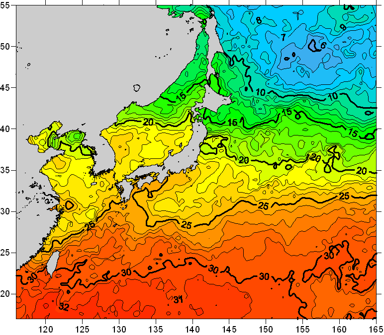 o 2010년 06월 19일 북서태평양 광역해양 수온분포 입니다. o 아래 위성 수온분포도는 국립수산과학원(NFRDI, Korea)과 일본동북대학교 (Tohoku University, Japan)가 공동연구개발 진행중, 1차 연구결과인 것으로 구름의 영향을 배제한 신기술의 수온정보입니다.
