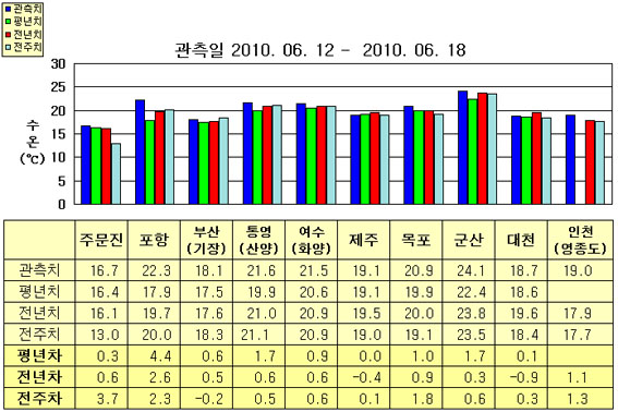 o 금주(2010.06.12~2010.06.18)의 한반도 연안 표면수온은 동해 연안역에서 섭씨 16.5~22.0도, 남해 연안역 19.0~21.5도, 서해 연안역에서 18.5~24.0도로 나타납니다. o 평년에 비해 동해 연안역은 0.5~4.5도 높게, 제주 비슷함을 제외한 남해 연안역은 0.5~2.0도 높게, 대천 비슷함을 제외한 서해 연안역은 1.0~2.0도 높게 나타납니다. o 전년에 비해 동해 연안역은 0.5~2.5도 높게, 제주 0.4도 낮음을 제외한 남해 연안역은 0.5도 높게, 대천 0.9도 낮음을 제외한 서해 연안역은 0.5~1.0도 높게 나타납니다.
