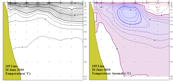 ㅇ 2010년 6월 20일 국립수산과학원 동해수산연구소에서 조사한 105선(동해 동방)의 수직수온분포도 및 평년편차도입니다.