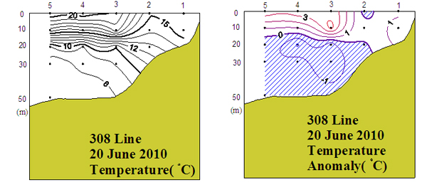 ㅇ 2010년 6월 20일 국립수산과학원 서해수산연구소에서 조사한 308선(대천 서방)의 수직수온분포도 및 평년편차도입니다.