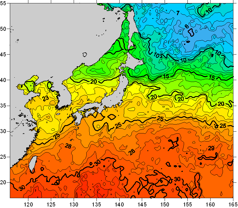 o 2010년 06월 25일 북서태평양 광역해양 수온분포 입니다. o 아래 위성 수온분포도는 국립수산과학원(NFRDI, Korea)과 일본동북대학교 (Tohoku University, Japan)가 공동연구개발 진행중, 1차 연구결과인 것으로 구름의 영향을 배제한 신기술의 수온정보입니다.