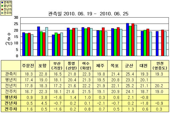 o 금주(2010.06.19~2010.06.25)의 한반도 연안 표면수온은 동해 연안역에서 섭씨 16.5~23.0도, 남해 연안역 19.5~22.5도, 서해 연안역에서 19.0~25.5도로 나타납니다. o 평년에 비해 부산 1.6도 낮음을 제외한 동해 연안역은 0.5~4.0도 높게, 제주 비슷함을 제외한 남해 연안역은 0.5~1.5도 높게, 대천 0.8도 낮음을 제외한 서해 연안역은 0.5~2.0도 높게 나타납니다. o 전년에 비해 부산 0.7도 낮음을 제외한 동해 연안역은 0.5~4.5도 높게, 제주 2.1도 낮음을 제외한 남해 연안역은 비슷하게, 군산 비슷함을 제외한 서해 연안역은 0.5~2.0도 낮게 나타납니다.