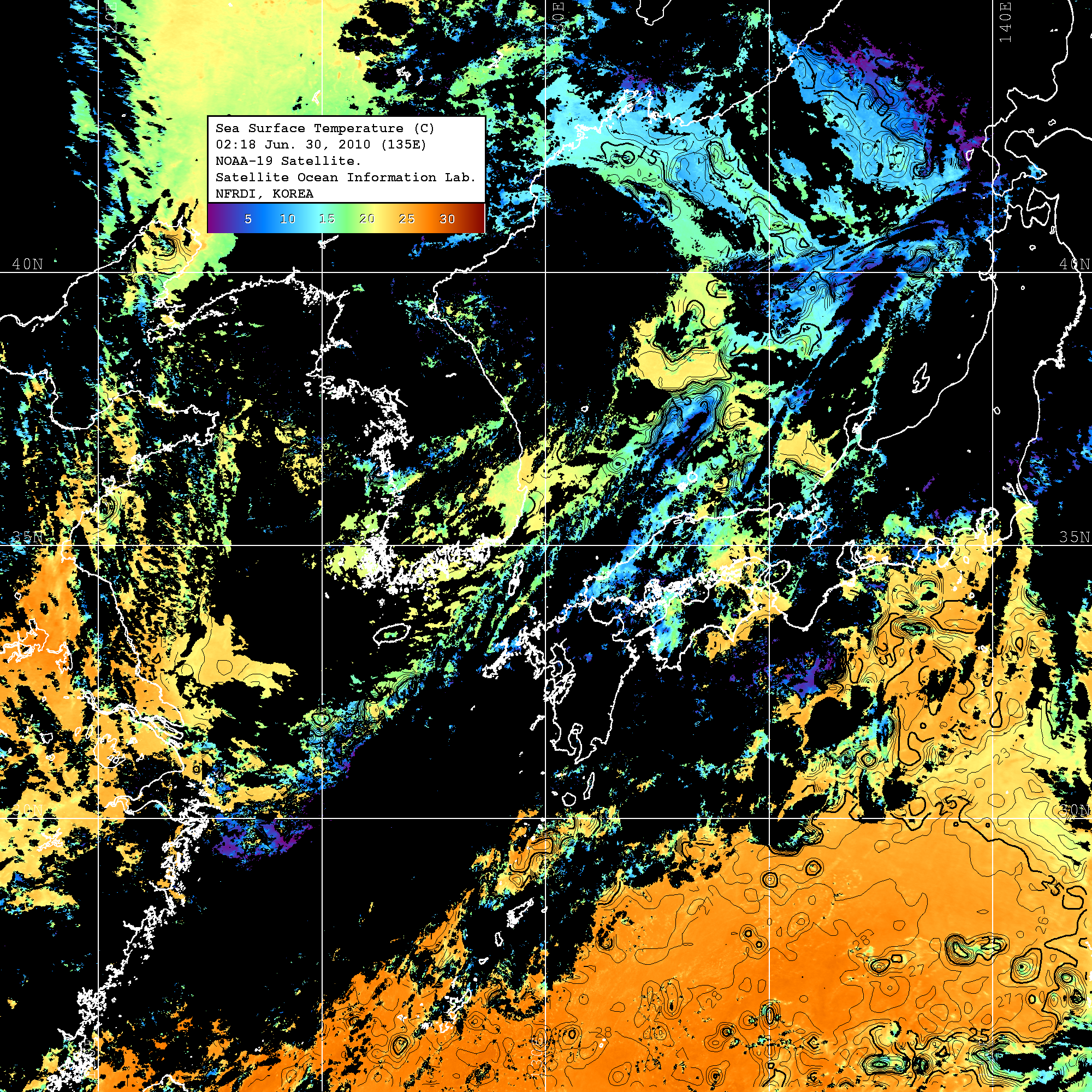 o 2010년 06월 30일 02시 18분 NOAA-19호 위성영상입니다. o 수온분포는 범례를 참고하시기 바랍니다. o 검은색은 구름을 나타냅니다. o 그림을 클릭하시면 크게 보실 수 있습니다.