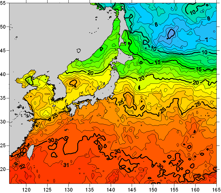o 2010년 06월 29일 북서태평양 광역해양 수온분포 입니다. o 아래 위성 수온분포도는 국립수산과학원(NFRDI, Korea)과 일본동북대학교 (Tohoku University, Japan)가 공동연구개발 진행중, 1차 연구결과인 것으로 구름의 영향을 배제한 신기술의 수온정보입니다.