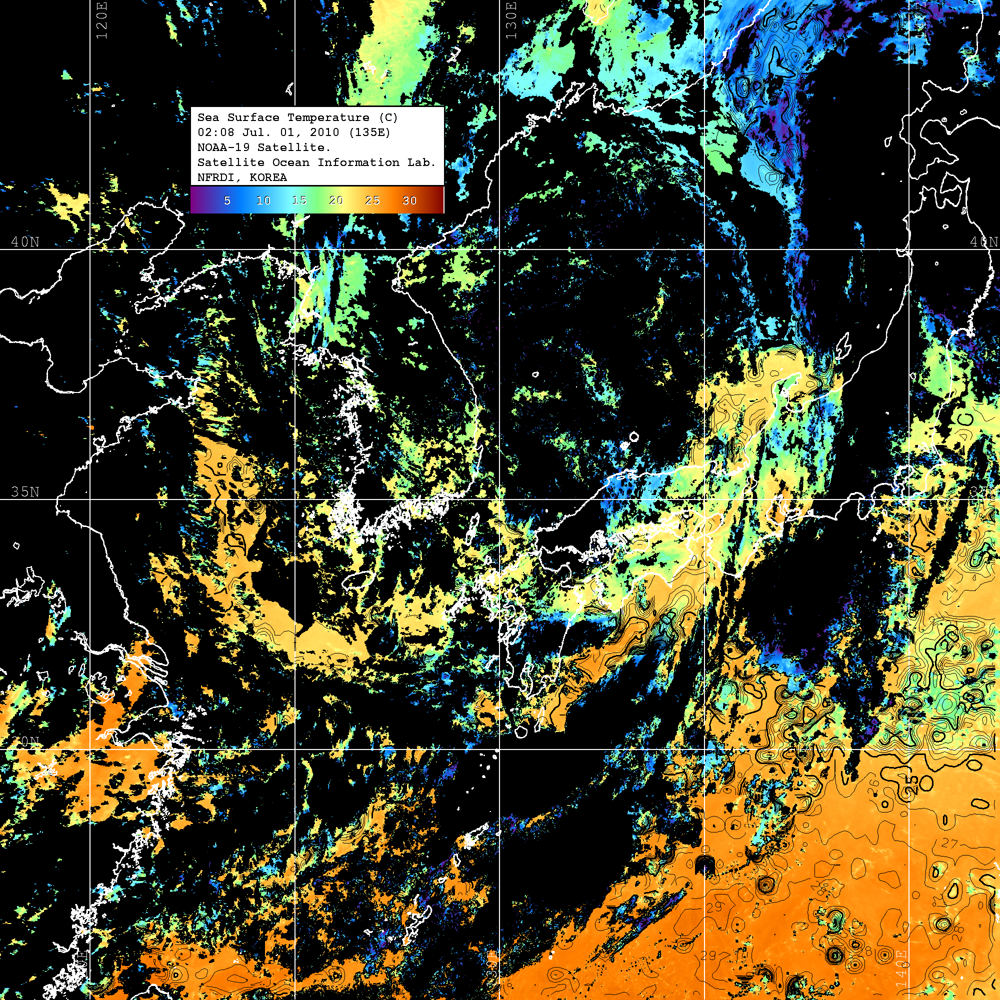 o 2010년 07월 01일 02시 08분 NOAA-19호 위성영상입니다. o 수온분포는 범례를 참고하시기 바랍니다. o 검은색은 구름을 나타냅니다. o 그림을 클릭하시면 크게 보실 수 있습니다.