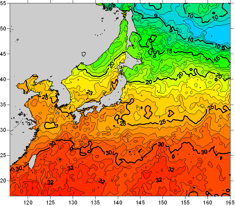 o 2010년 07월 04일 북서태평양 광역해양 수온분포 입니다. o 아래 위성 수온분포도는 국립수산과학원(NFRDI, Korea)과 일본동북대학교 (Tohoku University, Japan)가 공동연구개발 진행중, 1차 연구결과인 것으로 구름의 영향을 배제한 신기술의 수온정보입니다.