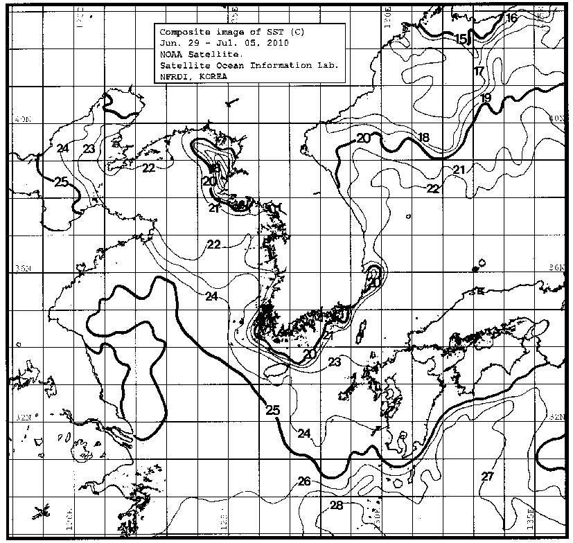 o 금주(2010.06.29~2010.07.05)의 한국근해 표면수온은 대화퇴 근해 21~22도, 울릉도 근해 22~23도, 대마도 근해 22~23도, 제주도 근해 22~24도, 이어도 근해 25~26도, 가거초 근해 24~25도, 어청도 근해 22~23도로 나타납니다. o「평년에 비해」대화퇴 근해 1.2도 높게, 울릉도 근해 0.8도 높게, 대마도 근해 0.5도 낮게, 제주도 근해 비슷하게, 이어도 근해 0.7도 높게, 가거초 근해 1.3도 높게, 어청도 근해는 0.8도 높게 나타납니다. o「전년에 비해」대화퇴 근해 1.5도 높게, 울릉도 근해 1.0도 낮게, 대마도 근해 1.0도 낮게, 제주도 근해 1.0도 낮게, 이어도 근해 0.5도 높게, 가거초 근해 1.0도 낮게, 어청도 근해는 1.5도 낮게 나타납니다. o 수온 전선대는 우리나라 제주해협에서 대한해협까지 22도를 중심으로 형성됩니다.
