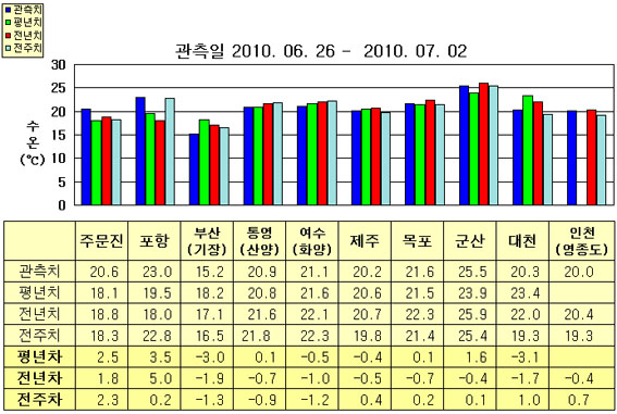 o 금주(2010.06.26~2010.07.02)의 한반도 연안 표면수온은 동해 연안역에서 섭씨 15.0~23.0도, 남해 연안역 20.0~21.5도, 서해 연안역에서 20.0~25.5도로 나타납니다. o 평년에 비해 부산 3.0도 낮음을 제외한 동해 연안역은 2.5~3.5도 높게, 통영(산양) 비슷함을 제외한 남해 연안역은 0.5도 낮게, 대천 3.1도 낮음을 제외한 서해 연안역은 0.5~1.5도 높게 나타납니다. o 전년에 비해 부산 1.9도 낮음을 제외한 동해 연안역은 1.5~5.0도 높게, 남해 연안역은 0.5~1.0도 낮게, 서해 연안역은 0.5~2.0도 낮게 나타납니다.
