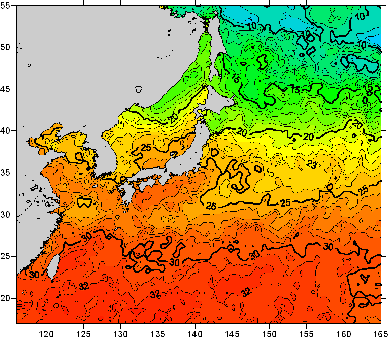 o 2010년 07월 05일 북서태평양 광역해양 수온분포 입니다. o 아래 위성 수온분포도는 국립수산과학원(NFRDI, Korea)과 일본동북대학교 (Tohoku University, Japan)가 공동연구개발 진행중, 1차 연구결과인 것으로 구름의 영향을 배제한 신기술의 수온정보입니다.