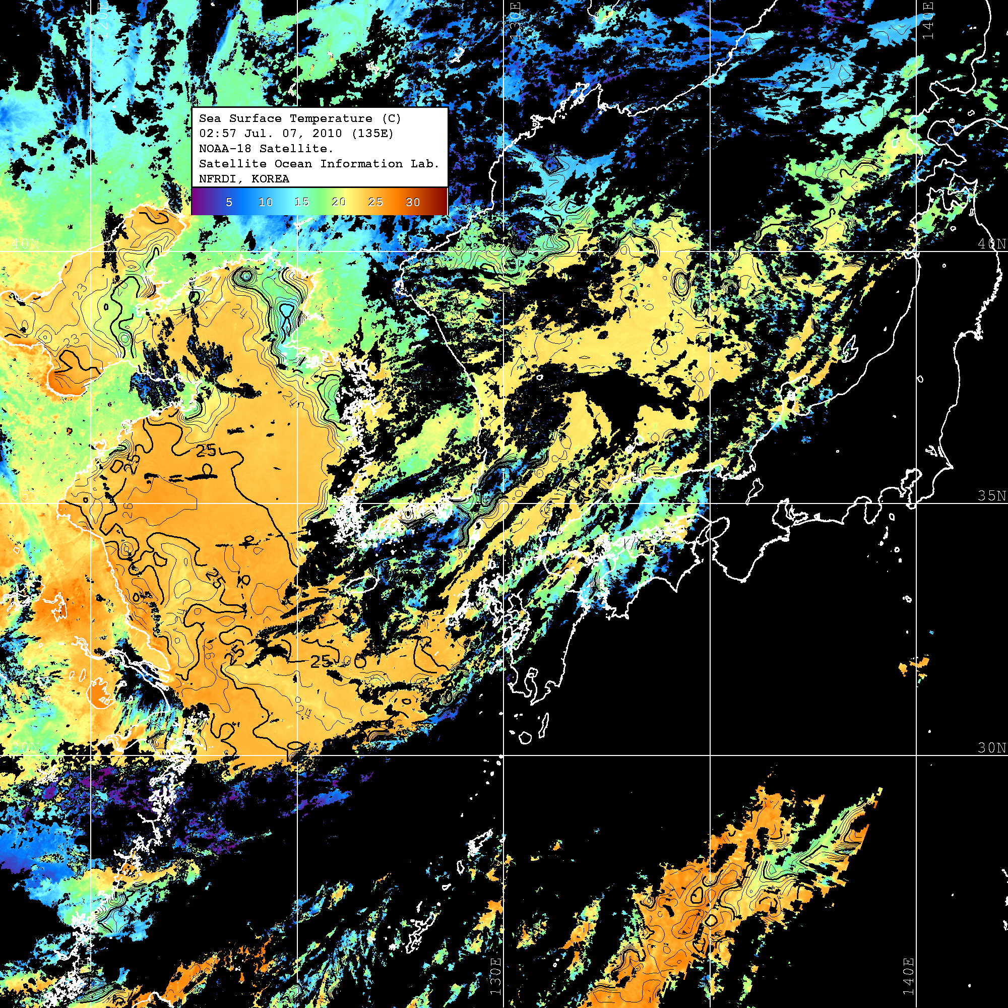 o 2010년 07월 07일 02시 57분 NOAA-18호 위성영상입니다. o 수온분포는 범례를 참고하시기 바랍니다. o 검은색은 구름을 나타냅니다. o 그림을 클릭하시면 크게 보실 수 있습니다.