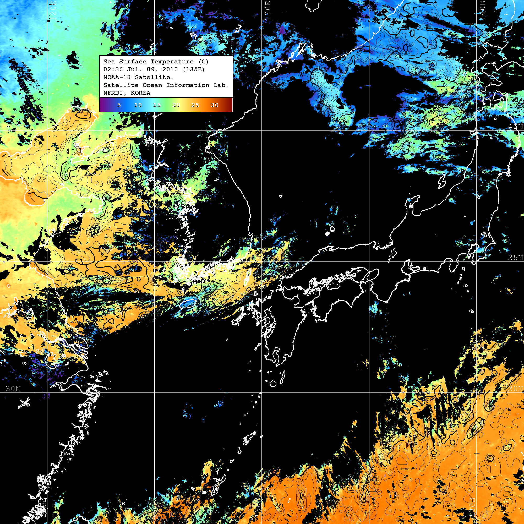 o 2010년 07월 09일 02시 36분 NOAA-18호 위성영상입니다. o 수온분포는 범례를 참고하시기 바랍니다. o 검은색은 구름을 나타냅니다. o 그림을 클릭하시면 크게 보실 수 있습니다.