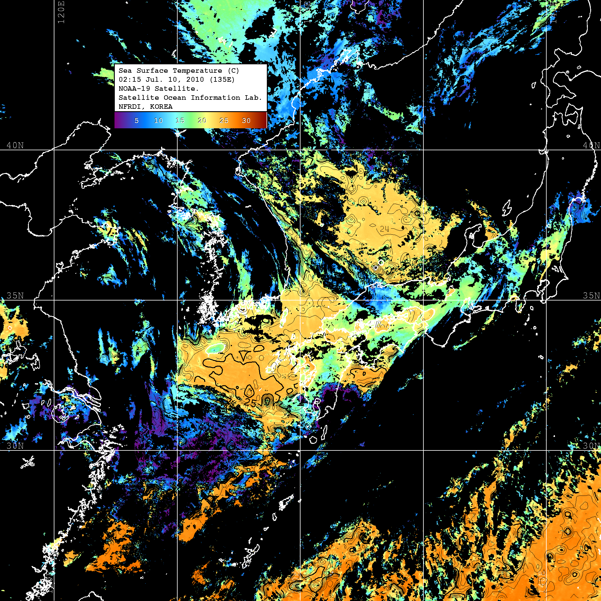 o 2010년 07월 10일 02시 15분 NOAA-19호 위성영상입니다. o 수온분포는 범례를 참고하시기 바랍니다. o 검은색은 구름을 나타냅니다. o 그림을 클릭하시면 크게 보실 수 있습니다.