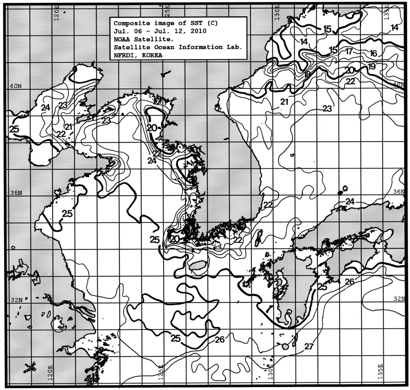 o 금주(2010.07.06~2010.07.12)의 한국근해 표면수온은 대화퇴 근해 21~22도, 울릉도 근해 23~24도, 대마도 근해 23~24도, 제주도 근해 23~24도, 이어도 근해 25~26도, 가거초 근해 23~25도, 어청도 근해 23~24도로 나타납니다. o「평년에 비해」대화퇴 근해 0.8도 높게, 울릉도 근해 1.9도 높게, 대마도 근해 0.9도 높게, 제주도 근해 비슷하게, 이어도 근해 비슷하게, 가거초 근해 1.6도 높게, 어청도 근해는 1.8도 높게 나타납니다. o「전년에 비해」대화퇴 근해 2.0도 높게, 울릉도 근해 2.0도 높게, 대마도 근해 0.5도 높게, 제주도 근해 2.0도 낮게, 이어도 근해 1.5도 낮게, 가거초 근해 4.0도 높게, 어청도 근해는 1.0도 높게 나타납니다. o 수온 전선대는 우리나라 제주해협에서 대한해협까지 23도를 중심으로 형성됩니다.