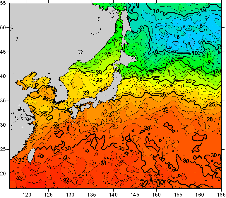 o 2010년 07월 12일 북서태평양 광역해양 수온분포 입니다. o 아래 위성 수온분포도는 국립수산과학원(NFRDI, Korea)과 일본동북대학교 (Tohoku University, Japan)가 공동연구개발 진행중, 1차 연구결과인 것으로 구름의 영향을 배제한 신기술의 수온정보입니다.