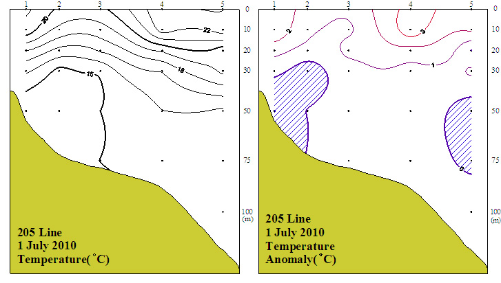 ㅇ 2010년 7월 1일 국립수산과학원 남서해수산연구소에서 조사한 205선(소리도 남동방)의 수직수온분포도 및 평년편차도 입니다.