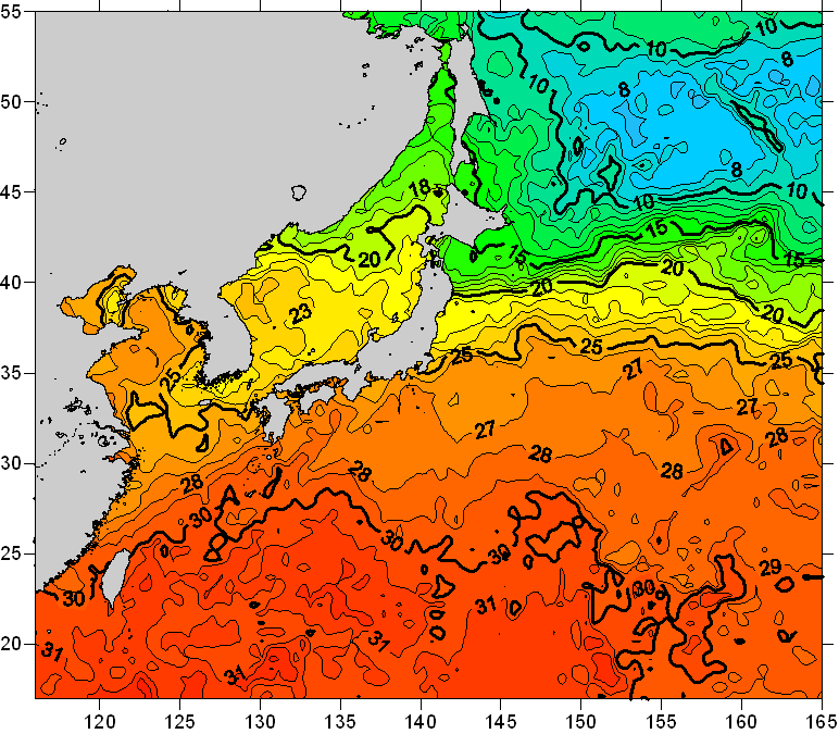 o 2010년 07월 14일 북서태평양 광역해양 수온분포 입니다. o 아래 위성 수온분포도는 국립수산과학원(NFRDI, Korea)과 일본동북대학교 (Tohoku University, Japan)가 공동연구개발 진행중, 1차 연구결과인 것으로 구름의 영향을 배제한 신기술의 수온정보입니다.