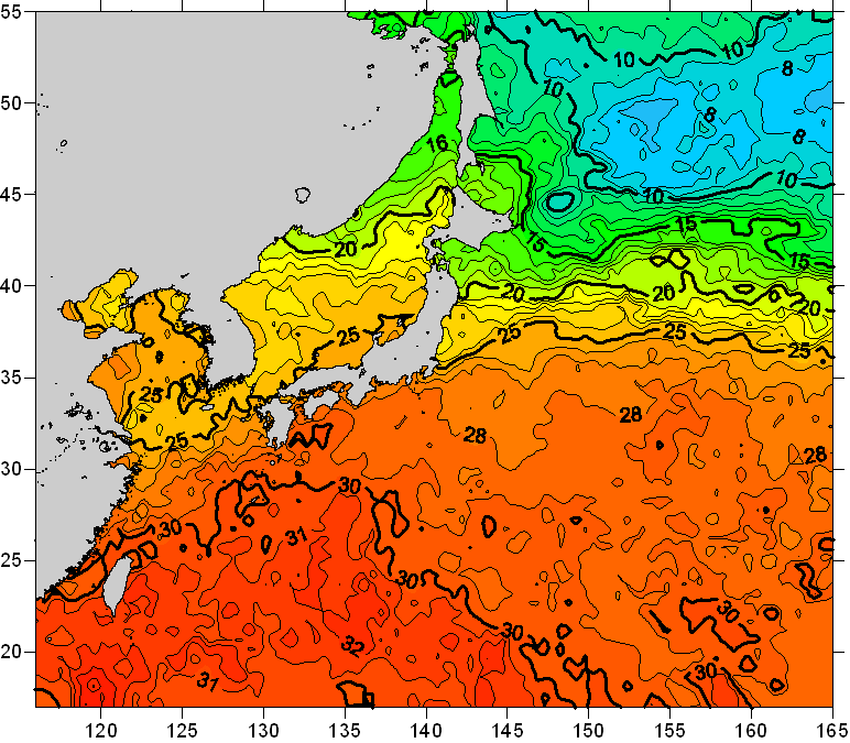 o 2010년 07월 16일 북서태평양 광역해양 수온분포 입니다. o 아래 위성 수온분포도는 국립수산과학원(NFRDI, Korea)과 일본동북대학교 (Tohoku University, Japan)가 공동연구개발 진행중, 1차 연구결과인 것으로 구름의 영향을 배제한 신기술의 수온정보입니다.