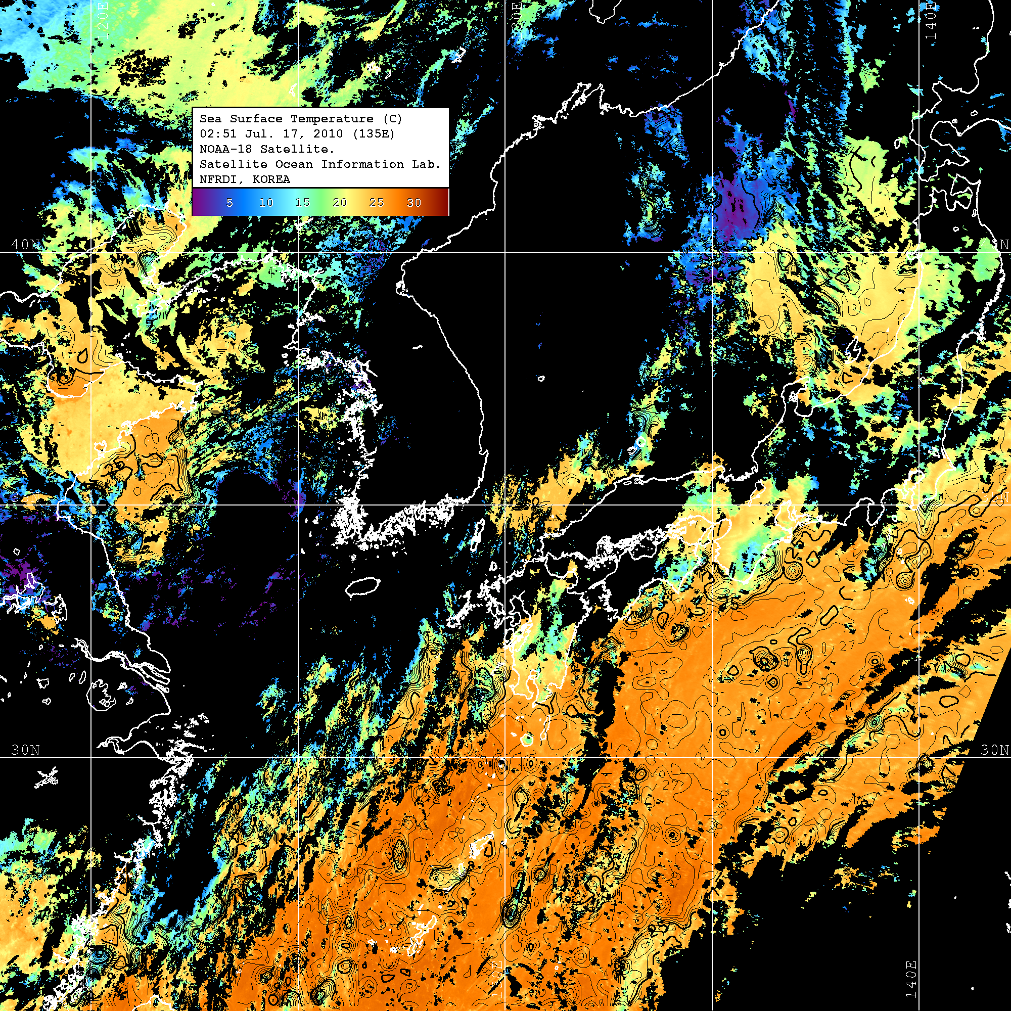 o 2010년 07월 17일 02시 51분 NOAA-18호 위성영상입니다. o 수온분포는 범례를 참고하시기 바랍니다. o 검은색은 구름을 나타냅니다. o 그림을 클릭하시면 크게 보실 수 있습니다.
