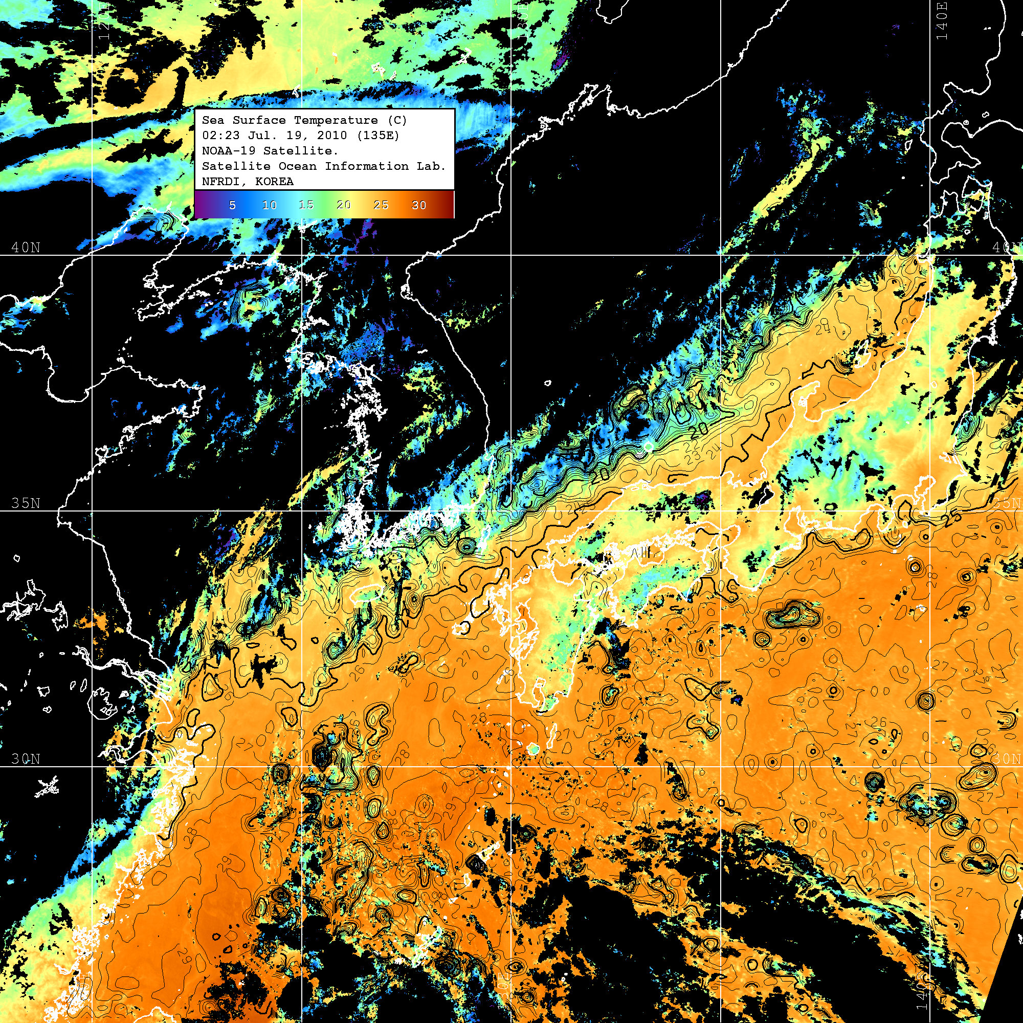 o 2010년 07월 19일 02시 23분 NOAA-19호 위성영상입니다. o 수온분포는 범례를 참고하시기 바랍니다. o 검은색은 구름을 나타냅니다. o 그림을 클릭하시면 크게 보실 수 있습니다.