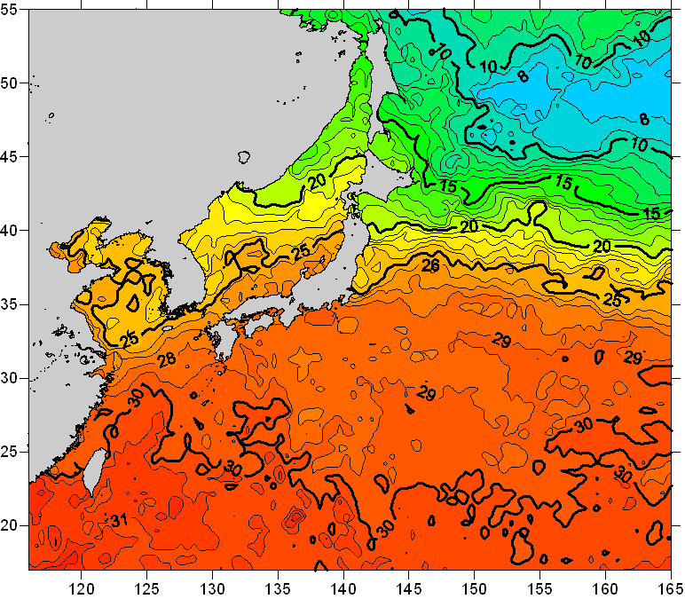 o 2010년 07월 18일 북서태평양 광역해양 수온분포 입니다. o 아래 위성 수온분포도는 국립수산과학원(NFRDI, Korea)과 일본동북대학교 (Tohoku University, Japan)가 공동연구개발 진행중, 1차 연구결과인 것으로 구름의 영향을 배제한 신기술의 수온정보입니다.