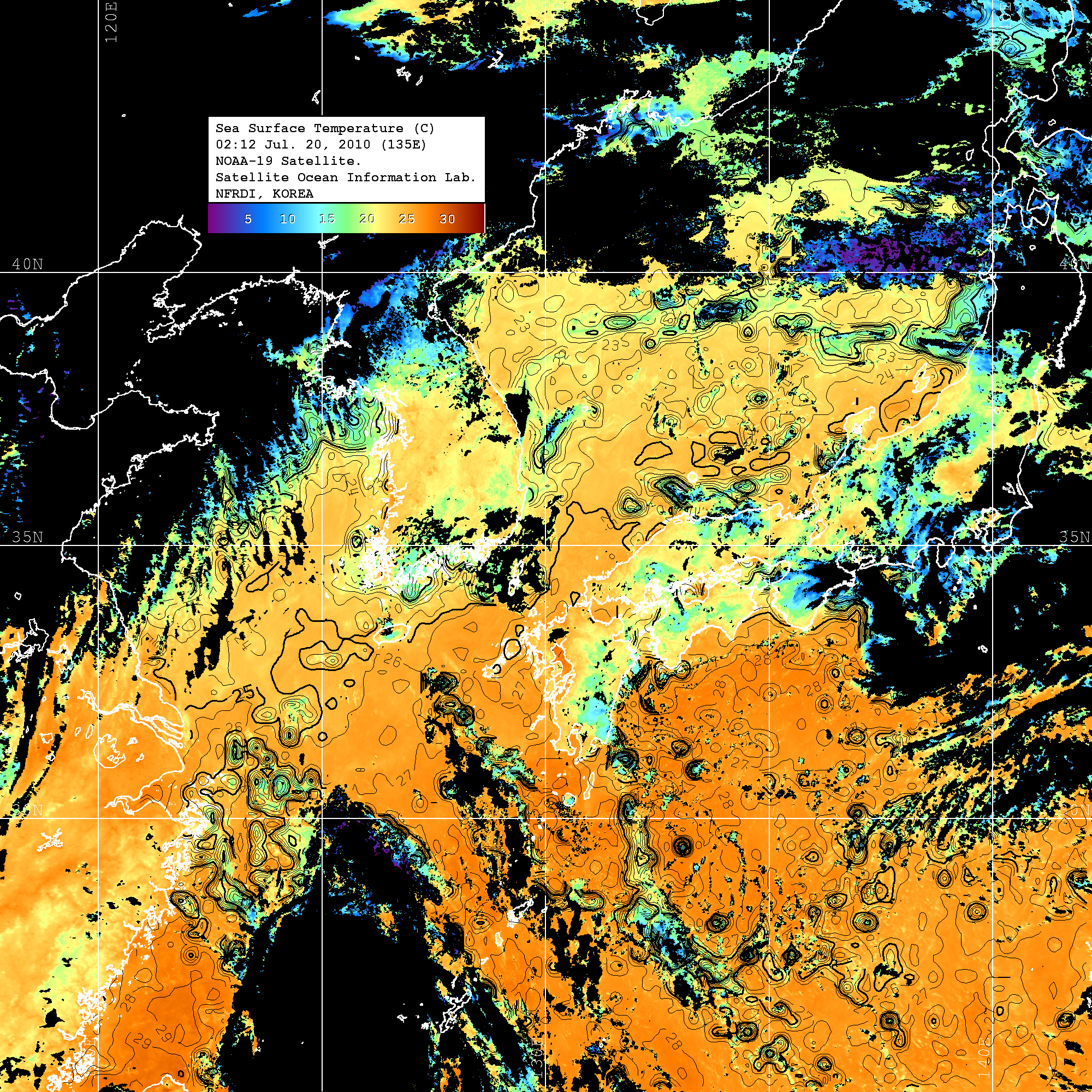 o 2010년 07월 20일 02시 12분 NOAA-19호 위성영상입니다. o 수온분포는 범례를 참고하시기 바랍니다. o 검은색은 구름을 나타냅니다. o 그림을 클릭하시면 크게 보실 수 있습니다.