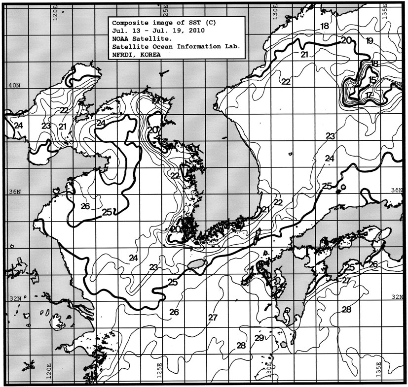 o 금주(2010.07.13~2010.07.19)의 한국근해 표면수온은 대화퇴 근해 20~22도, 울릉도 근해 22~23도, 대마도 근해 23~25도, 제주도 근해 23~25도, 이어도 근해 25~26도, 가거초 근해 22~23도, 어청도 근해 22~23도로 나타납니다. o「평년에 비해」대화퇴 근해 0.3도 낮게, 울릉도 근해 0.4도 높게, 대마도 근해 0.3도 낮게, 제주도 근해 0.6도 낮게, 이어도 근해 1.2도 낮게, 가거초 근해 1.6도 낮게, 어청도 근해는 비슷하게 나타납니다. o「전년에 비해」대화퇴 근해 2.0도 높게, 울릉도 근해 1.0도 높게, 대마도 근해 2.0도 낮게, 제주도 근해 3.0도 낮게, 이어도 근해 2.5도 낮게, 가거초 근해 4.0도 낮게, 어청도 근해는 1.0도 높게 나타납니다. o 수온 전선대는 우리나라 제주해협에서 대한해협까지 23도를 중심으로 형성됩니다.