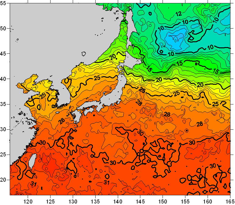o 2010년 07월 21일 북서태평양 광역해양 수온분포 입니다. o 아래 위성 수온분포도는 국립수산과학원(NFRDI, Korea)과 일본동북대학교 (Tohoku University, Japan)가 공동연구개발 진행중, 1차 연구결과인 것으로 구름의 영향을 배제한 신기술의 수온정보입니다.