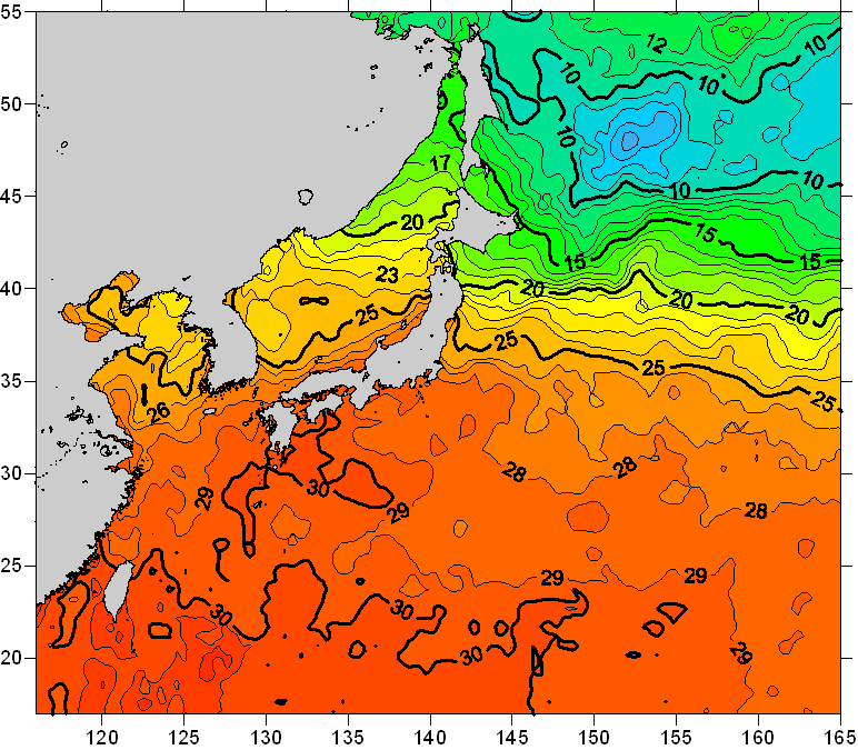 o 2010년 07월 23일 북서태평양 광역해양 수온분포 입니다. o 아래 위성 수온분포도는 국립수산과학원(NFRDI, Korea)과 일본동북대학교 (Tohoku University, Japan)가 공동연구개발 진행중, 1차 연구결과인 것으로 구름의 영향을 배제한 신기술의 수온정보입니다.