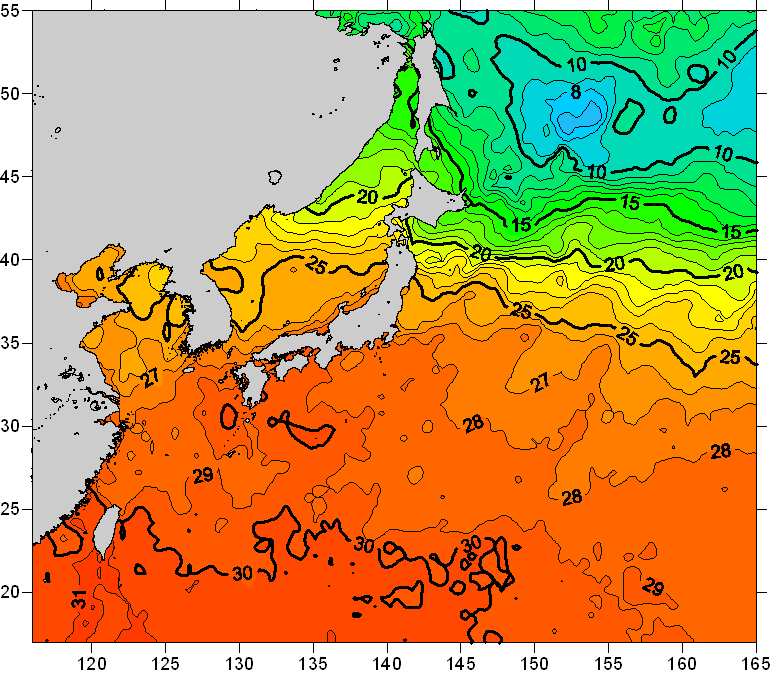 o 2010년 07월 24일 북서태평양 광역해양 수온분포 입니다. o 아래 위성 수온분포도는 국립수산과학원(NFRDI, Korea)과 일본동북대학교 (Tohoku University, Japan)가 공동연구개발 진행중, 1차 연구결과인 것으로 구름의 영향을 배제한 신기술의 수온정보입니다.