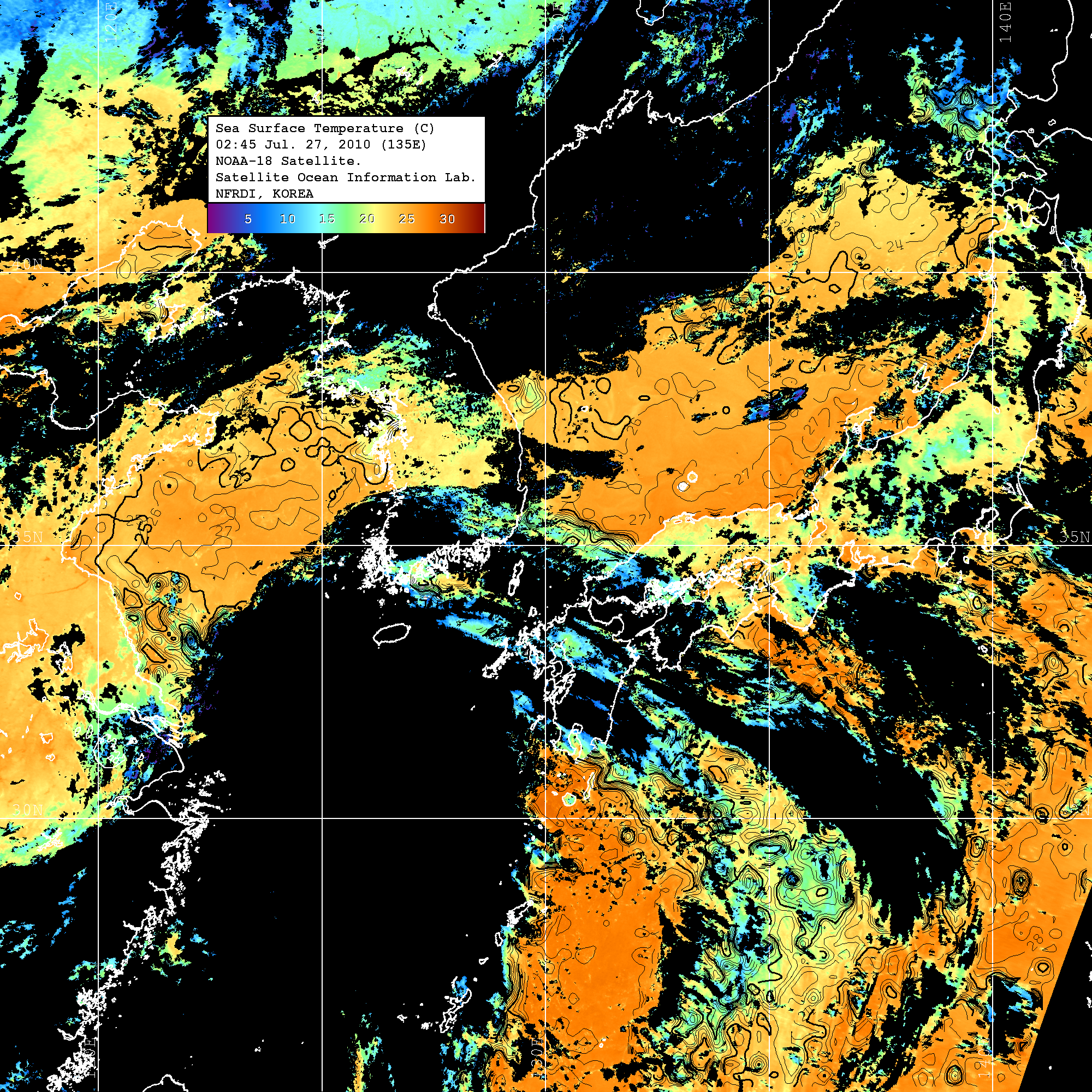 o 2010년 07월 27일 02시 45분 NOAA-18호 위성영상입니다. o 수온분포는 범례를 참고하시기 바랍니다. o 검은색은 구름을 나타냅니다. o 그림을 클릭하시면 크게 보실 수 있습니다.