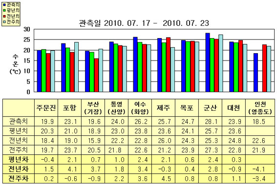 o 금주(2010.07.17~2010.07.23)의 한반도 연안 표면수온은 동해 연안역에서 섭씨 19.5~23.0도, 남해 연안역 24.0~26.5도, 서해 연안역에서 18.5~28.0도로 나타납니다. o 평년에 비해 주문진 0.4도 낮음을 제외한 동해 연안역은 0.5~2.0도 높게, 남해 연안역은 1.0~2.5도 높게, 서해 연안역은 0.5~2.5도 높게 나타납니다. o 전년에 비해 동해 연안역은 1.5~4.0도 높게, 제주 0.3도 낮음을 제외한 남해 연안역은 1.5~3.5도 높게, 대천 1.0도, 인천(용유도) 4.1도 낮음을 제외한 서해 연안역은 0.5~3.0도 높게 나타납니다. o 2010년 07월 22일 관측한 수온자료를 보면 울진 연안은 8.1도, 죽변 연안은 14.6도, 동해시 연안은 13.9도 울기 연안은 17.2도의 분포를 보여, 울진, 죽변, 동해시 연안은 냉수대 경보를 울기 연안은 냉수대 주의보가 발령 되었습니다.