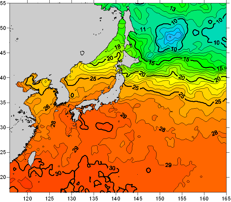 o 2010년 07월 26일 북서태평양 광역해양 수온분포 입니다. o 아래 위성 수온분포도는 국립수산과학원(NFRDI, Korea)과 일본동북대학교 (Tohoku University, Japan)가 공동연구개발 진행중, 1차 연구결과인 것으로 구름의 영향을 배제한 신기술의 수온정보입니다.