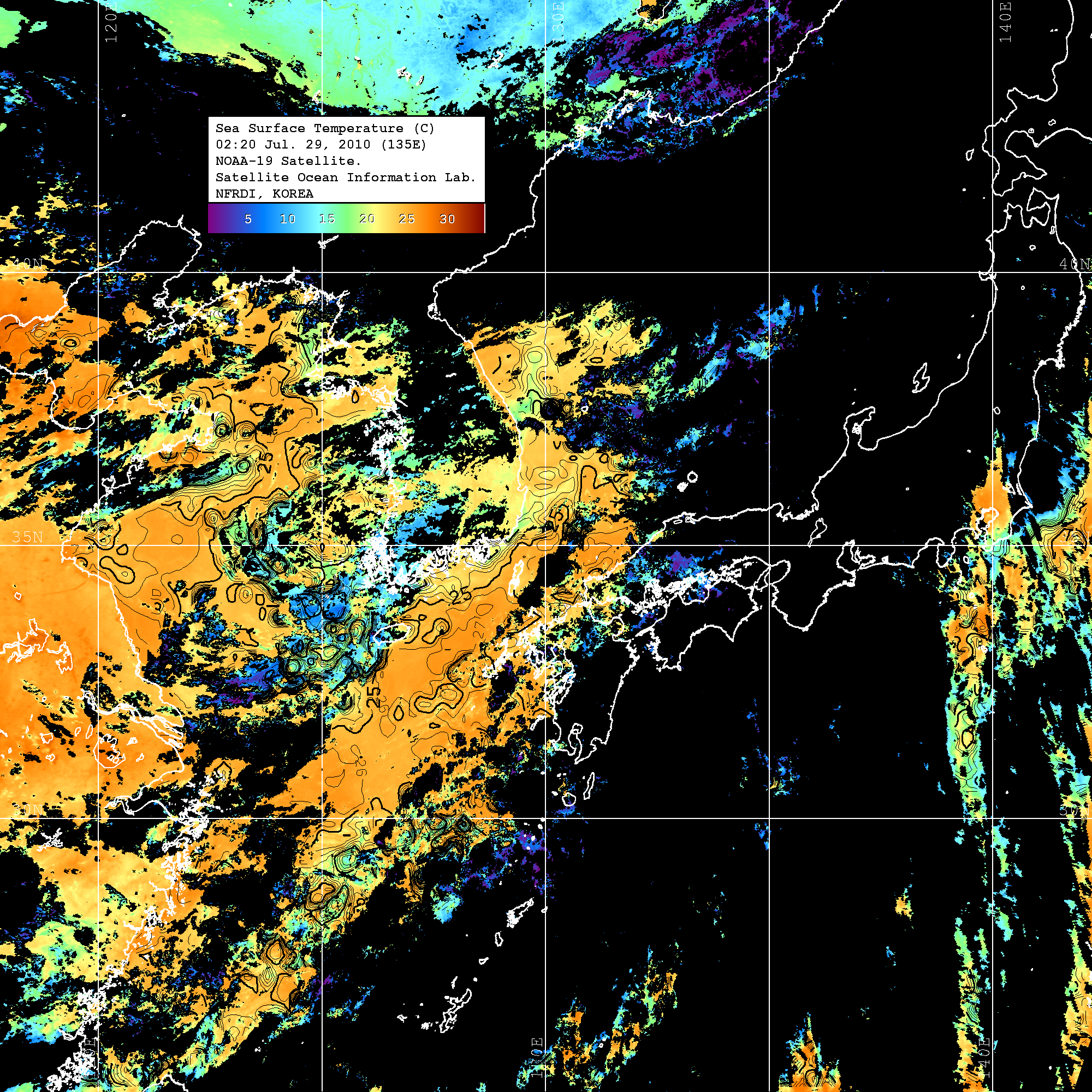o 2010년 07월 29일 02시 20분 NOAA-19호 위성영상입니다. o 수온분포는 범례를 참고하시기 바랍니다. o 검은색은 구름을 나타냅니다. o 그림을 클릭하시면 크게 보실 수 있습니다.