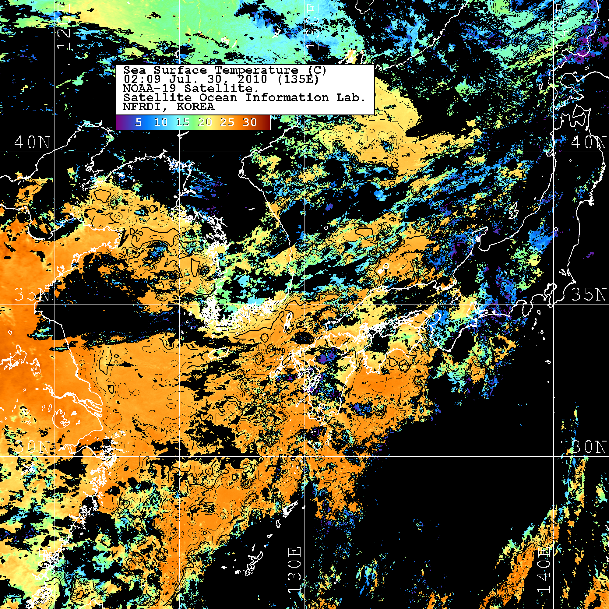 o 2010년 07월 30일 02시 09분 NOAA-19호 위성영상입니다. o 수온분포는 범례를 참고하시기 바랍니다. o 검은색은 구름을 나타냅니다. o 그림을 클릭하시면 크게 보실 수 있습니다.