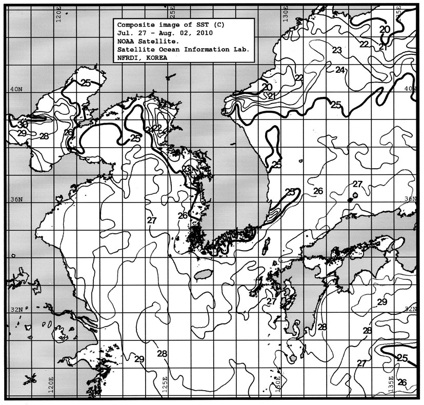 o 금주(2010.07.27~2010.08.02)의 한국근해 표면수온은 대화퇴 근해 24~25도, 울릉도 근해 25~26도, 대마도 근해 27~28도, 제주도 근해 26~27도, 이어도 근해 26~27도, 가거초 근해 26~27도, 어청도 근해 23~24도로 나타납니다. o「평년에 비해」대화퇴 근해 2.1도 높게, 울릉도 근해 1.9도 높게, 대마도 근해 1.6도 높게, 제주도 근해 0.3도 낮게, 이어도 근해 0.9도 낮게, 가거초 근해 0.6도 높게, 어청도 근해는 비슷하게 나타납니다. o「전년에 비해」대화퇴 근해 4.5도 높게, 울릉도 근해 4.0도 높게, 대마도 근해 2.5도 높게, 제주도 근해 0.5도 낮게, 이어도 근해 1.5도 높게, 가거초 근해 2.0도 높게, 어청도 근해는 비슷하게 나타납니다. o 수온 전선대는 우리나라 제주해협에서 대한해협까지 26도를 중심으로 형성됩니다.