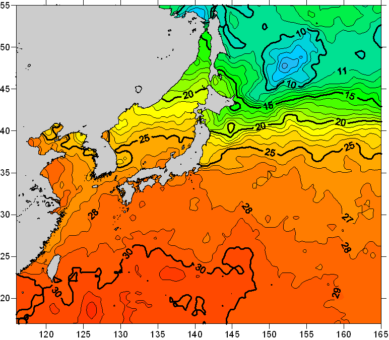 o 2010년 08월 01일 북서태평양 광역해양 수온분포 입니다. o 아래 위성 수온분포도는 국립수산과학원(NFRDI, Korea)과 일본동북대학교 (Tohoku University, Japan)가 공동연구개발 진행중, 1차 연구결과인 것으로 구름의 영향을 배제한 신기술의 수온정보입니다.