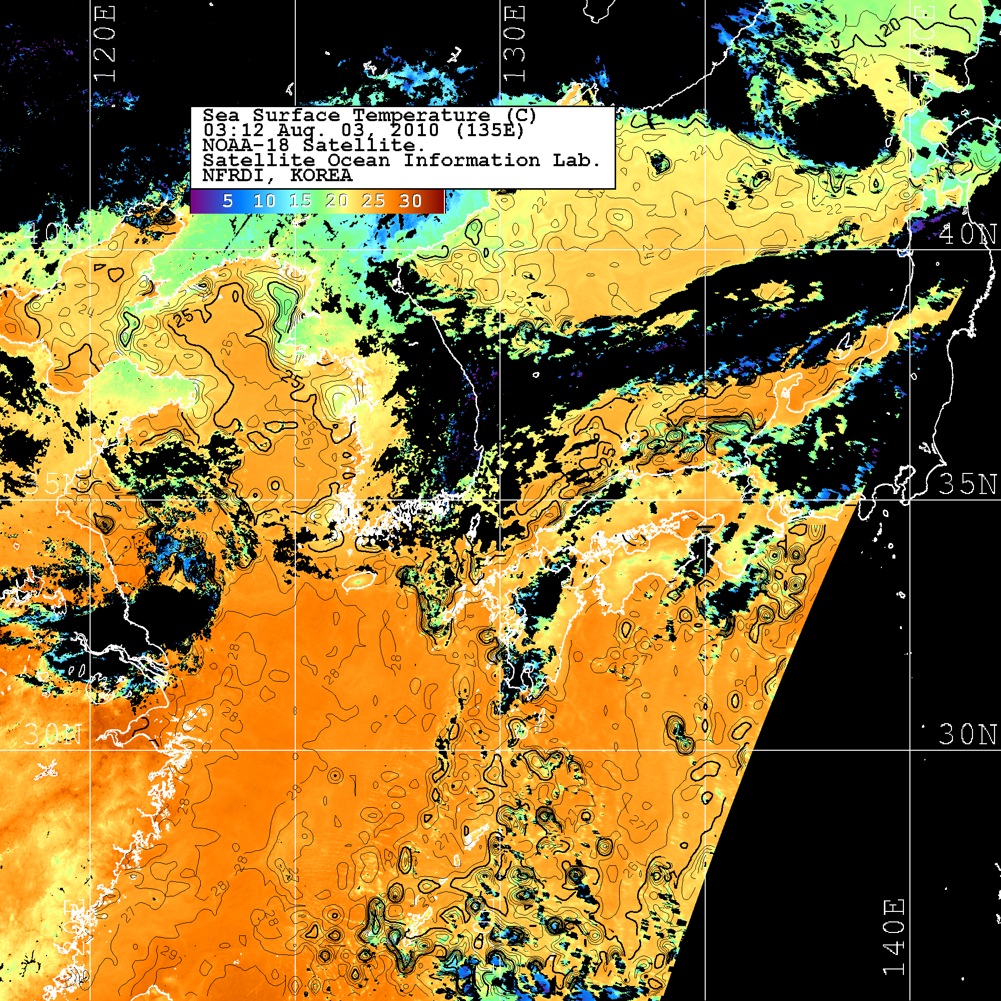 o 2010년 08월 03일 03시 12분 NOAA-18호 위성영상입니다. o 수온분포는 범례를 참고하시기 바랍니다. o 검은색은 구름을 나타냅니다. o 그림을 클릭하시면 크게 보실 수 있습니다.
