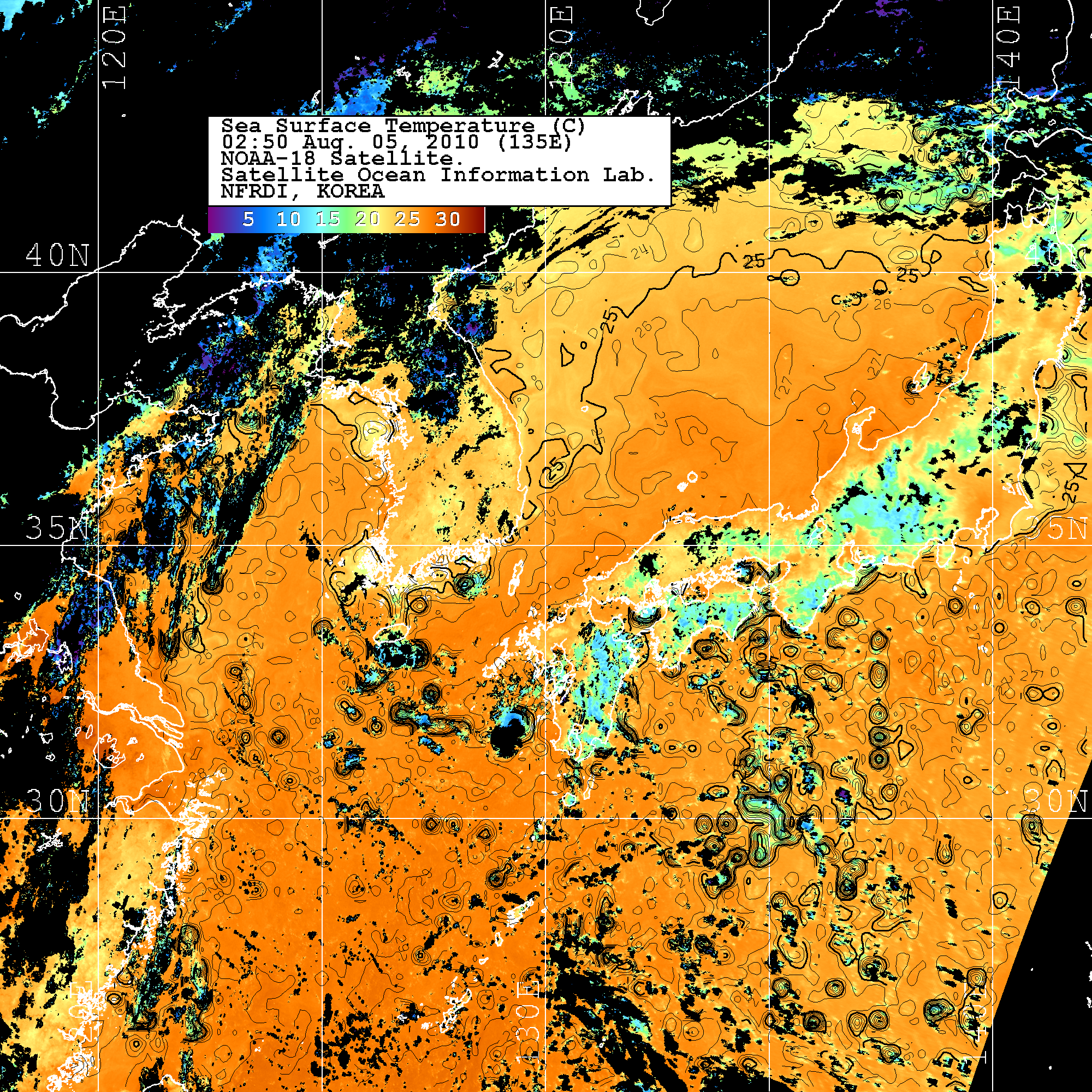 o 2010년 08월 05일 02시 50분 NOAA-18호 위성영상입니다. o 수온분포는 범례를 참고하시기 바랍니다. o 검은색은 구름을 나타냅니다. o 그림을 클릭하시면 크게 보실 수 있습니다.