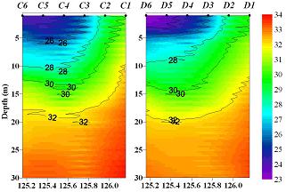 ㅇ 또한 제주도 서방 약 18km 해역에 염분 26.8~28.0psu(두께 5m)의 저염분수가 관측되었고 제주도 서방 72km 해역에 염분 23.3~27.9psu(두께 9m)의 저염분수가 관측되었습니다.