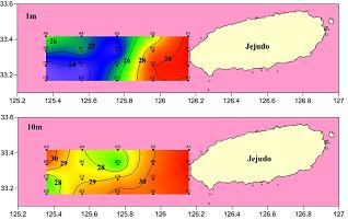 ㅇ 2010년 8월 3일 제주특별자치도 해양수산연구원, 국립수산과학원 아열대연구센터에서 조사한 저염분수 조사 결과입니다.