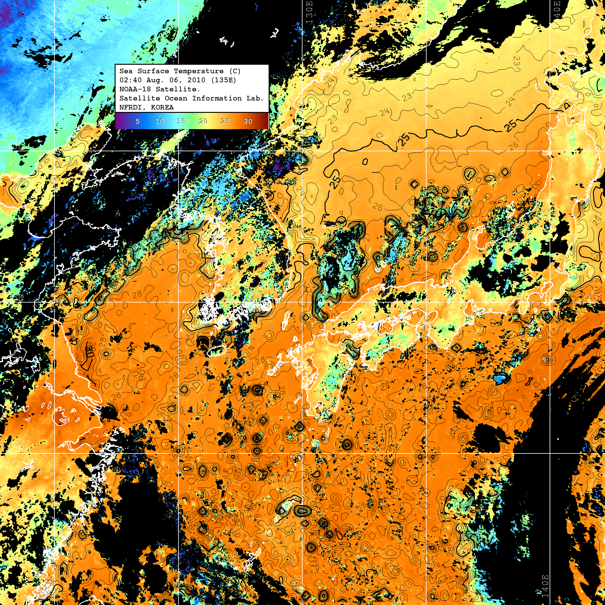 o 2010년 08월 06일 02시 40분 NOAA-18호 위성영상입니다. o 수온분포는 범례를 참고하시기 바랍니다. o 검은색은 구름을 나타냅니다. o 그림을 클릭하시면 크게 보실 수 있습니다.