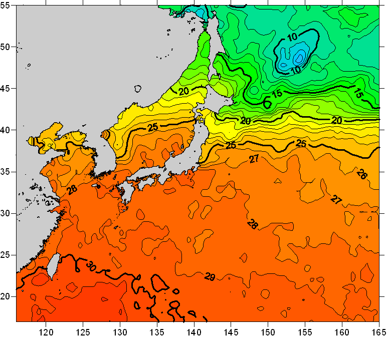 o 2010년 08월 05일 북서태평양 광역해양 수온분포 입니다. o 아래 위성 수온분포도는 국립수산과학원(NFRDI, Korea)과 일본동북대학교 (Tohoku University, Japan)가 공동연구개발 진행중, 1차 연구결과인 것으로 구름의 영향을 배제한 신기술의 수온정보입니다.