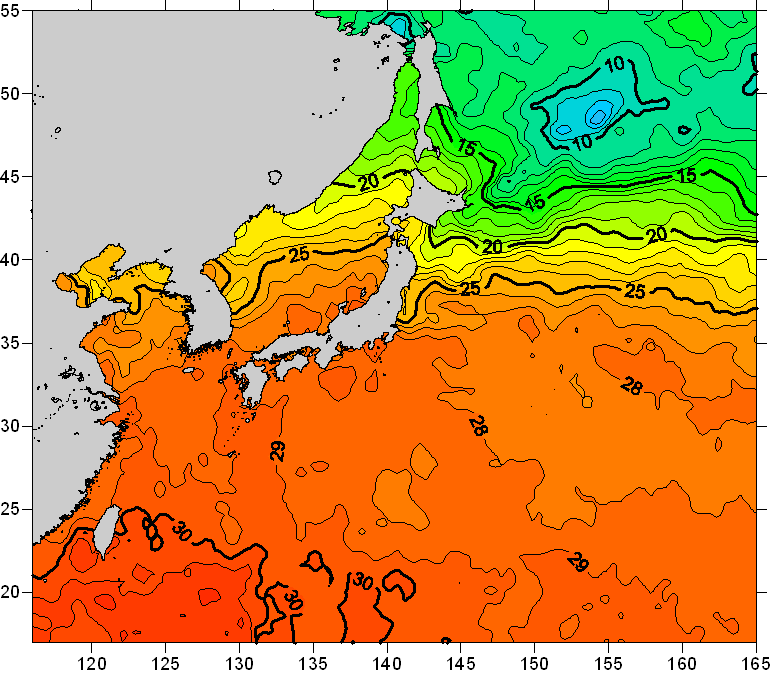 o 2010년 08월 06일 북서태평양 광역해양 수온분포 입니다. o 아래 위성 수온분포도는 국립수산과학원(NFRDI, Korea)과 일본동북대학교 (Tohoku University, Japan)가 공동연구개발 진행중, 1차 연구결과인 것으로 구름의 영향을 배제한 신기술의 수온정보입니다.