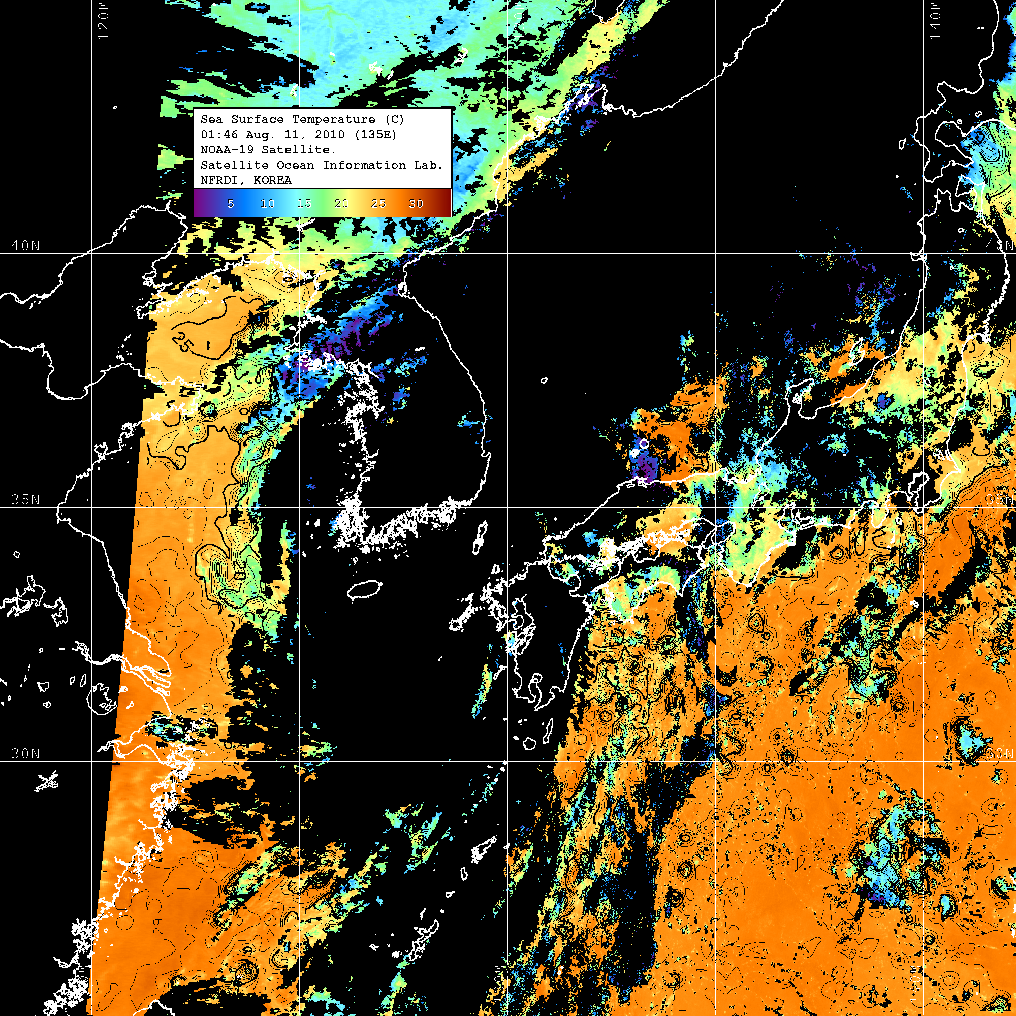 o 2010년 08월 11일 01시 46분 NOAA-19호 위성영상입니다. o 수온분포는 범례를 참고하시기 바랍니다. o 검은색은 구름을 나타냅니다. o 그림을 클릭하시면 크게 보실 수 있습니다.