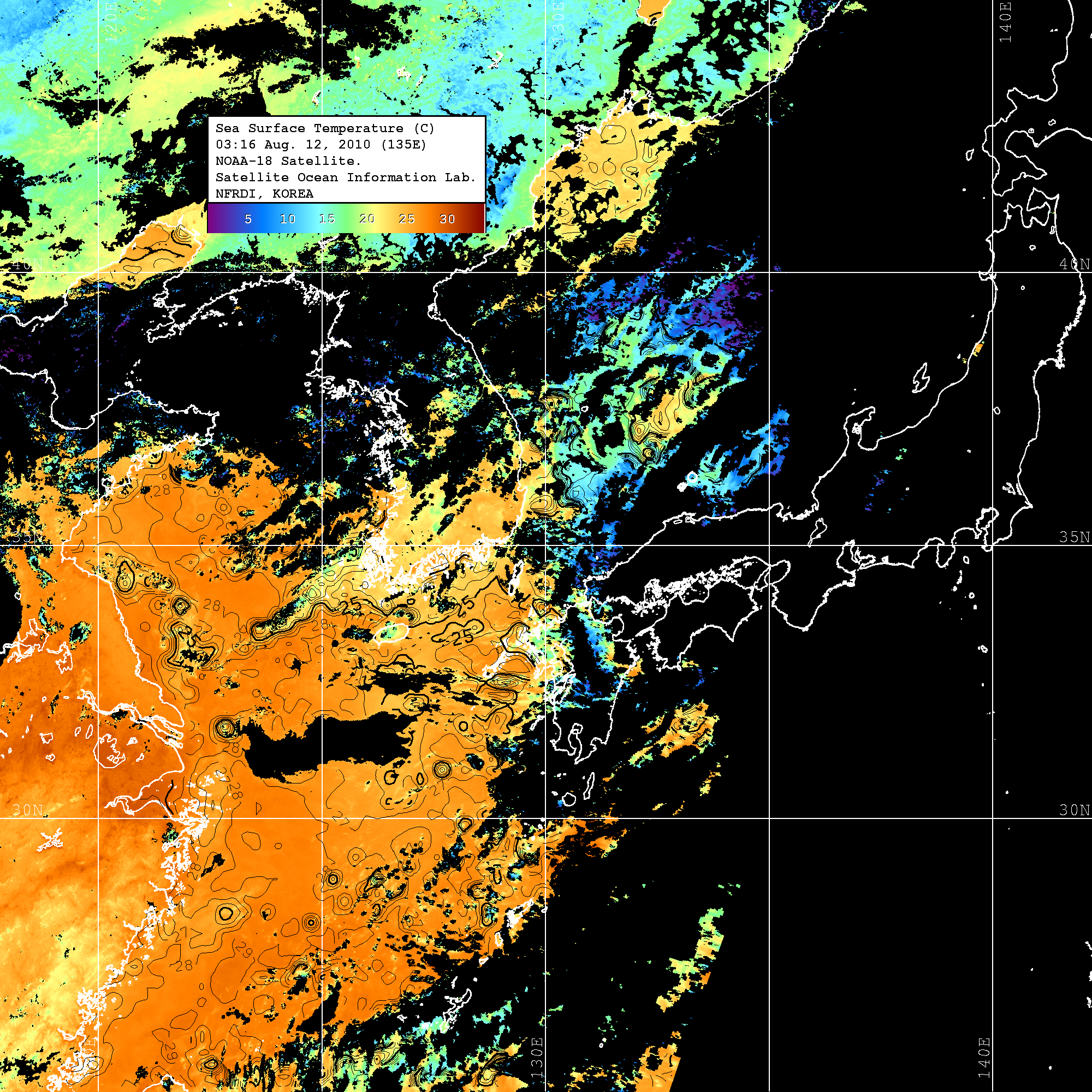 o 2010년 08월 12일 03시 16분 NOAA-18호 위성영상입니다. o 수온분포는 범례를 참고하시기 바랍니다. o 검은색은 구름을 나타냅니다. o 그림을 클릭하시면 크게 보실 수 있습니다.