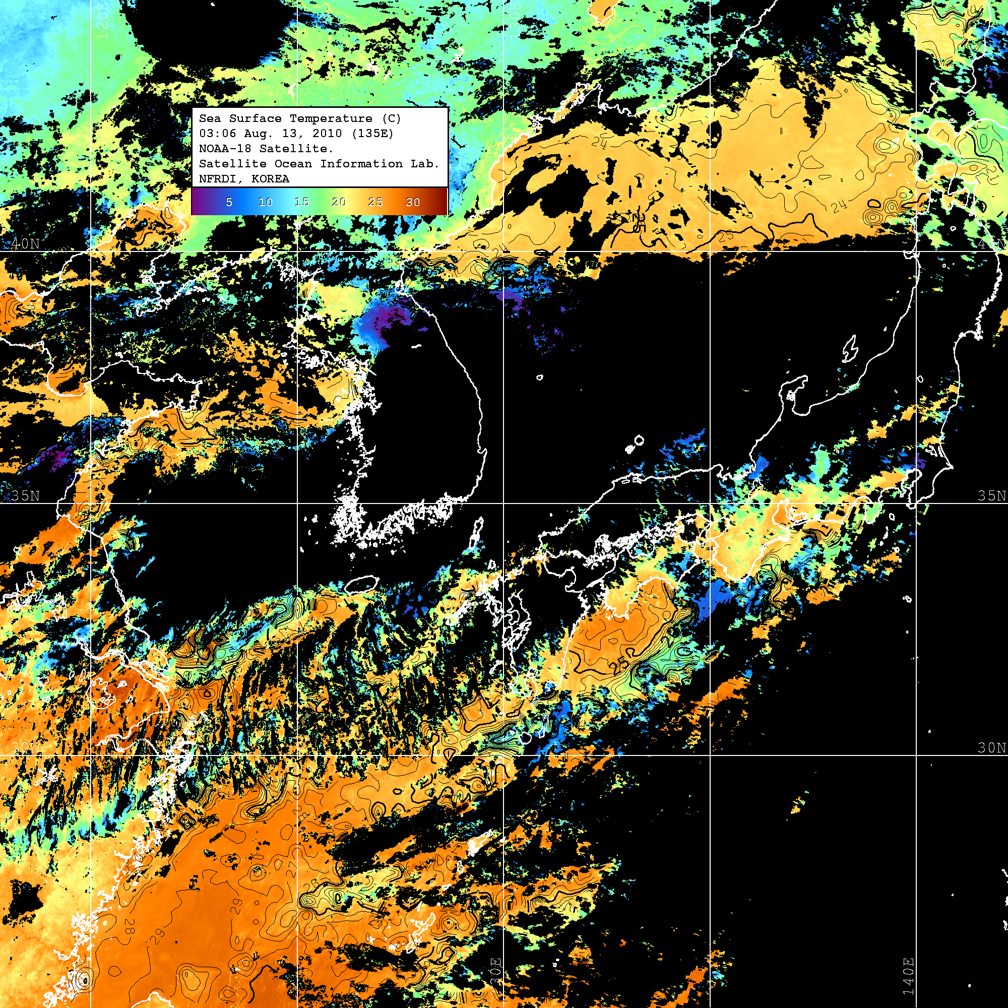 o 2010년 08월 13일 03시 06분 NOAA-18호 위성영상입니다. o 수온분포는 범례를 참고하시기 바랍니다. o 검은색은 구름을 나타냅니다. o 그림을 클릭하시면 크게 보실 수 있습니다.