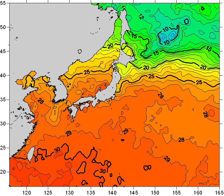 o 2010년 08월 12일 북서태평양 광역해양 수온분포 입니다. o 아래 위성 수온분포도는 국립수산과학원(NFRDI, Korea)과 일본동북대학교 (Tohoku University, Japan)가 공동연구개발 진행중, 1차 연구결과인 것으로 구름의 영향을 배제한 신기술의 수온정보입니다.